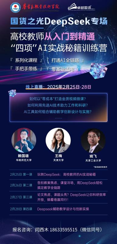 在人工智能技术日新月异的今天,DeepSeek作为最具影响力的国产AI技术之一,已经成为教育创新的重要推动力。为帮助学院教师全面掌握DeepSeek在教育领域的应用,深入了解并应用DeepSeek技术,特举办《DeepSeek专场——高校教师从入门到精通“四项”AI实战秘籍训练营》,现将有关事项通知如下: