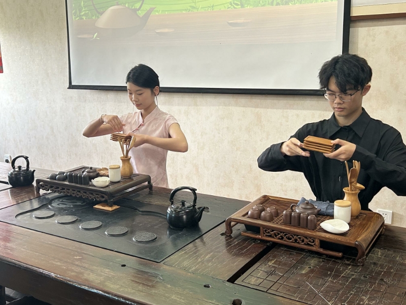 中华茶艺展示环节,茶艺老师及茶艺社的同学们身着传统服饰,动作优雅地展示着茶叶的冲泡过程。从温杯洁具、投茶注水,到斟茶奉茶,每一个步骤都伴随着细致的讲解,将 “和、敬、清、寂” 的茶道精神娓娓道来。俄罗斯青少年们围坐四周,目不转睛地观察着茶叶在水中舒展沉浮,氤氲茶香中,他们还亲自端起茶盏,细细品味,感受着中国茶文化的深邃内涵。