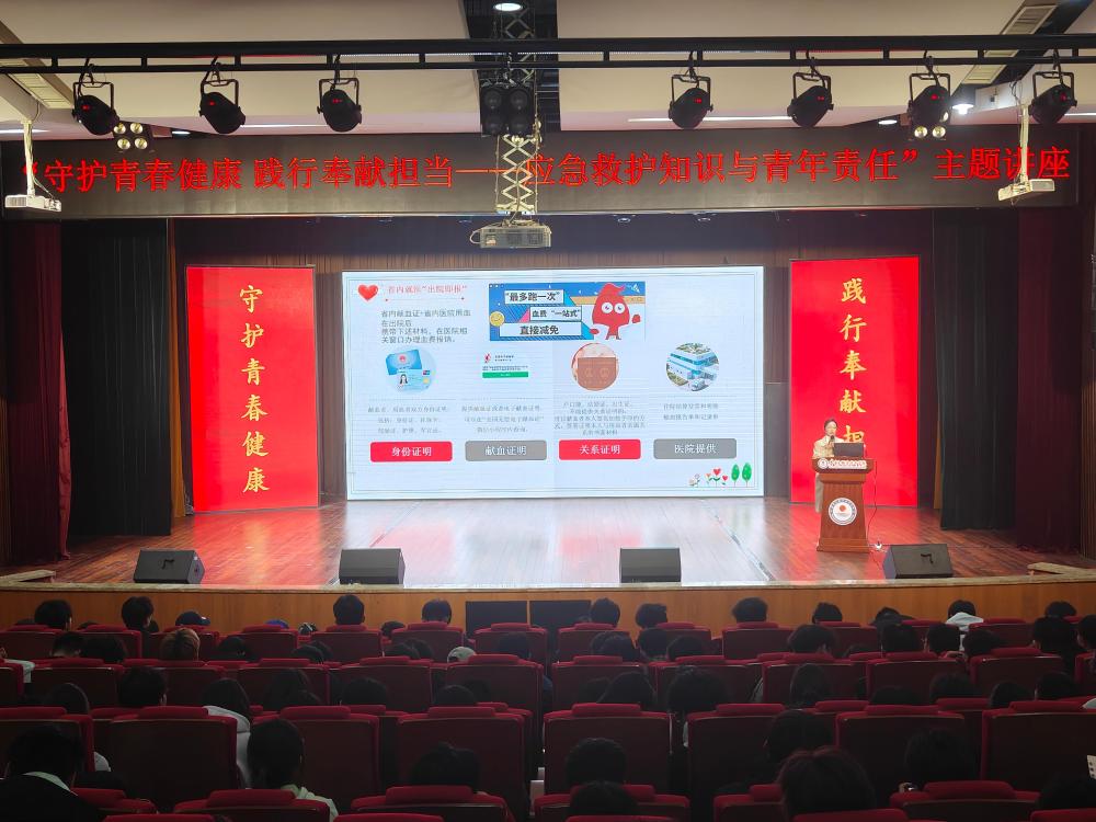 讲座围绕应急救护核心常识、突发状况处置流程及实操要点,结合真实案例进行系统讲解;同时聚焦青少年健康防护、无偿献血的重要意义与规范流程,解答学生日常健康困惑。其间还设有奖知识问答环节,现场学生踊跃参与,气氛热烈。
