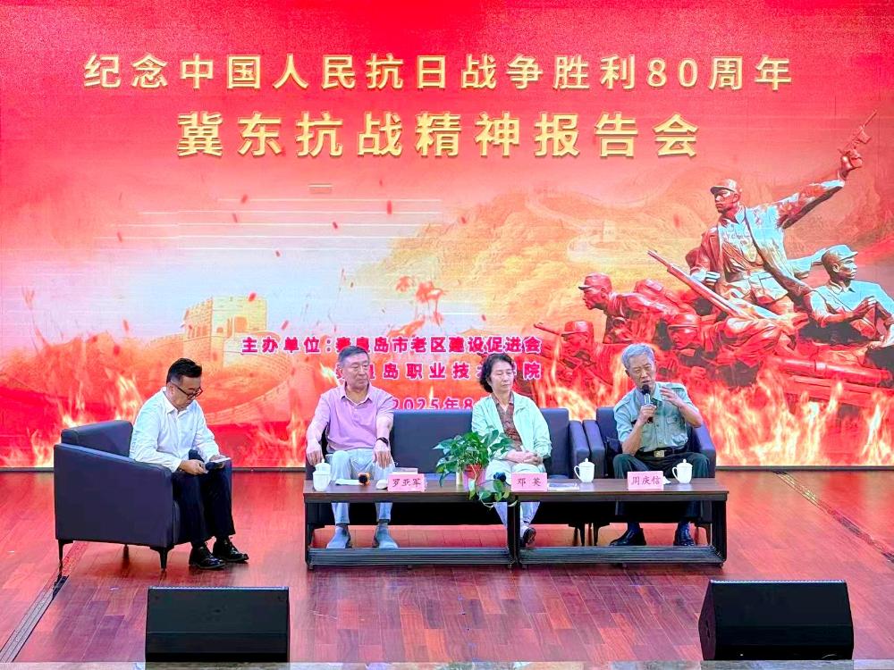 【新闻中心讯】8月28日,秦皇岛市老区建设促进会与学院联合主办的"纪念中国人民抗日战争胜利80周年·冀东抗战精神报告会"在学院报告厅举行。开国上将邓华之女邓英、开国少将罗文之子罗亚军、冀东抗日英雄周子丰之子周庆信三位红色后代,携父辈的烽火记忆走进校园,为500余名青年学子上了一堂跨越时空的爱国主义思政课。市老区建设促进会会长刘瑞玲,学院党委书记、院长蔡大勇与师生共同聆听。