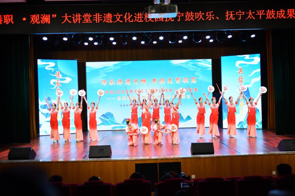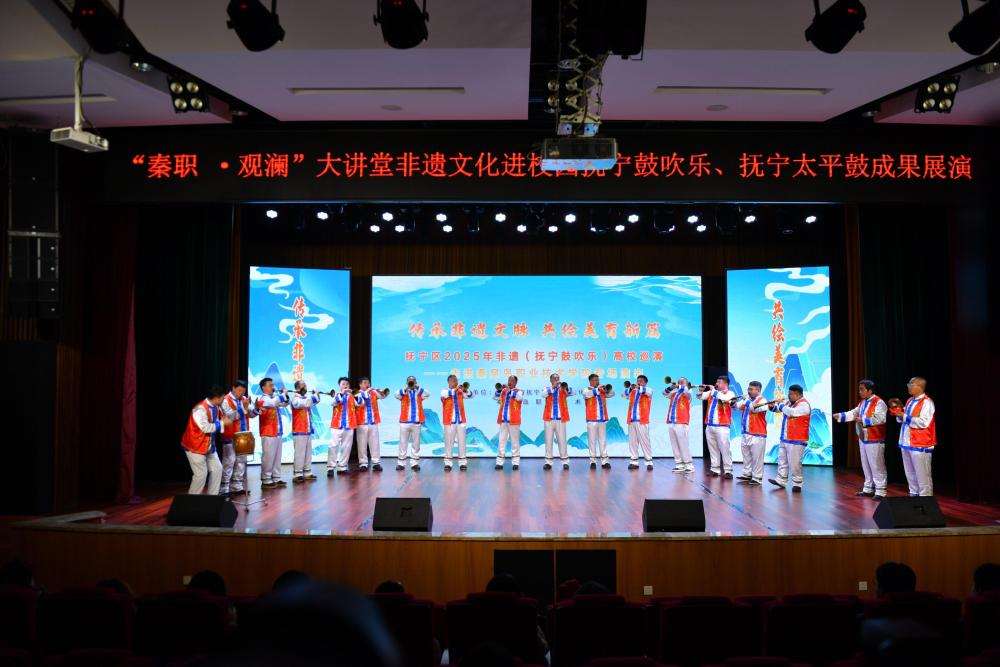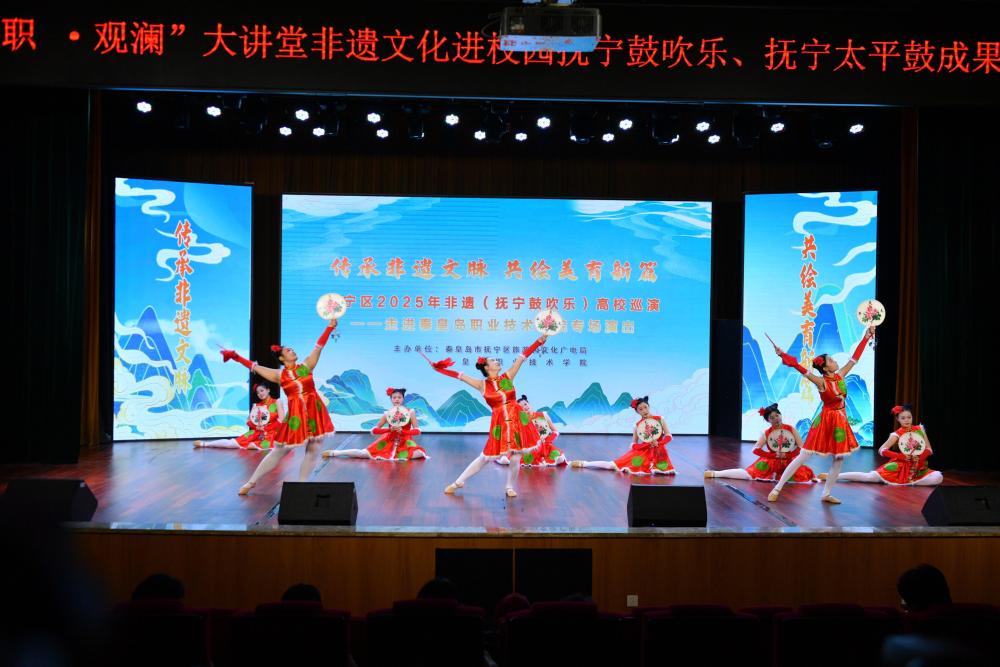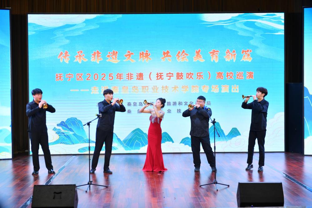 揭牌仪式后,国家级非物质文化遗产项目抚宁鼓吹乐省级传承人和河北省非物质文化遗产项目抚宁太平鼓省级传承人带领团队共同演绎“传承非遗文脉 共绘美育新篇”— 抚宁区 2025 年非遗(抚宁鼓吹乐)高校巡演项目。《逗鹁鸪》《柳青娘》等经典乐曲悠扬婉转,原创作品《百年秧歌情》以质朴真挚的旋律诉说文化传承故事;学院艺术系师生联袂呈现的《原生态太平鼓》则尽显青春风采,让在场师生直观感受非遗艺术的独特韵味与蓬勃生命力。