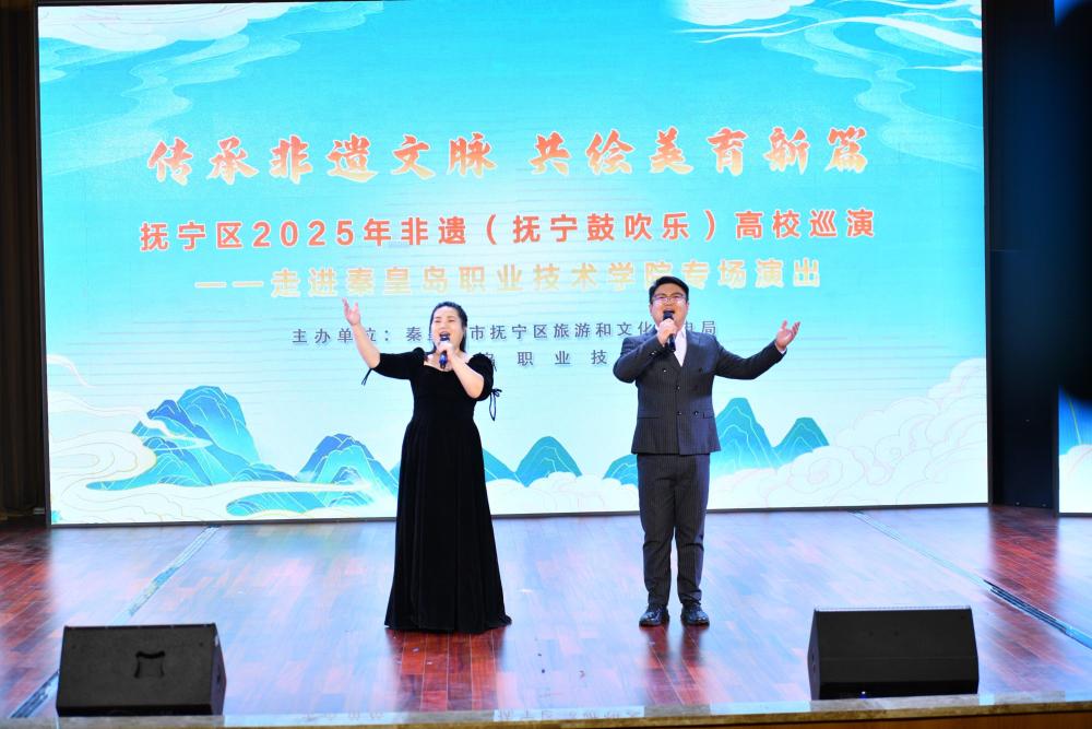 【新闻中心讯】11月11日,“秦职・观澜” 大讲堂之非遗文化进校园——抚宁鼓吹乐、抚宁太平鼓成果展演暨 “抚宁鼓吹乐、抚宁太平鼓传承保护基地” 揭牌仪式在学院报告厅举行。活动由秦皇岛市抚宁区旅游和文化广电局与学院联合主办。秦皇岛市旅游和文化广电局副局长刘彦广,抚宁区旅游和文化广电局局长单勇,市旅游和文化广电局非遗科科长于恩才,抚宁区旅游和文化广电局副局长李建伟,学院副院长吕健伟出席活动现场。