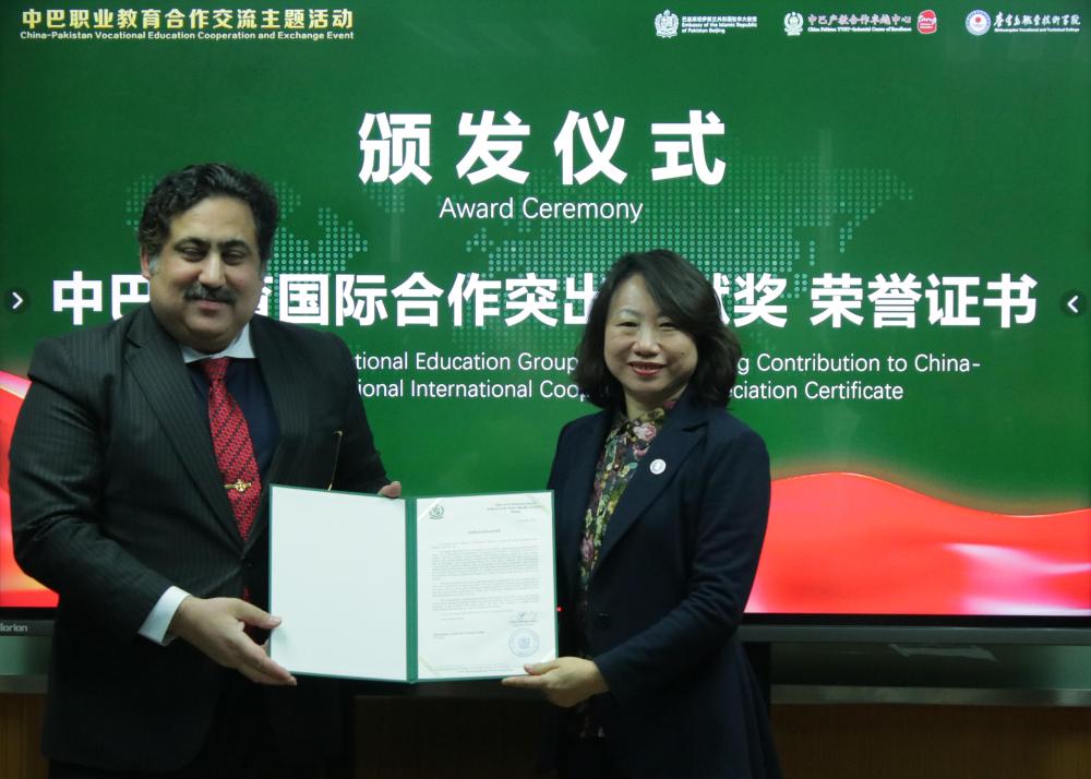 巴基斯坦驻华大使馆副大使艾扎兹・汗(Mr. Aizaz Khan)高度认可学院在“中巴女性职业教育国际合作示范项目”中的出色工作,将此项目命名为“丝路姐妹”,向学院颁发了“中巴教育国际合作突出贡献奖”荣誉牌匾及证书。