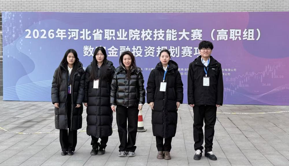 【新闻中心讯】12月27日,2026年河北省职业院校技能大赛(高职组)“数字金融投资规划”赛项在石家庄举行,全省20所高职院校参赛。学院商贸系刘净萱、刘佳宁、穆唐宇和马宏伟四位同学组成的代表队在激烈的角逐中脱颖而出,荣获一等奖。