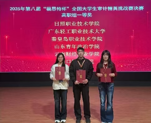 【新闻中心讯】11月29日,2025年第八届“福思特杯”全国大学生审计精英挑战赛决赛在南京审计大学举行。学院经济系学生霍灿雯、李嘉欣、孙佳易荣获高职组一等奖。