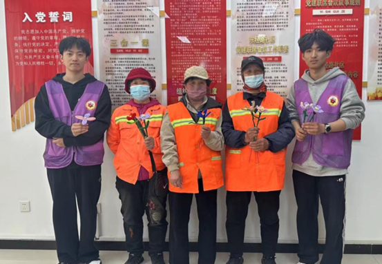 在“暖心互动区”,开展了“送你一朵小红花”手工制作活动。建筑与设计系鲁班志愿服务队队员于浩然、苏一俣同学将五颜六色的扭扭棒分发给大家,协助现场老师进行演示和讲解。在两位志愿者的协助指导下,社区居民将扭扭棒很快就变成了一束束盛开的花朵,并将扭扭棒小红花送给了城市最美的劳动者。