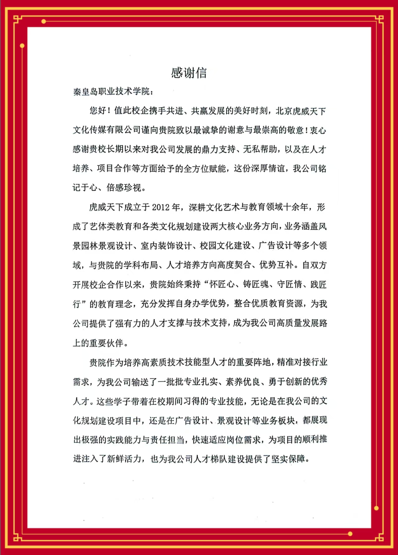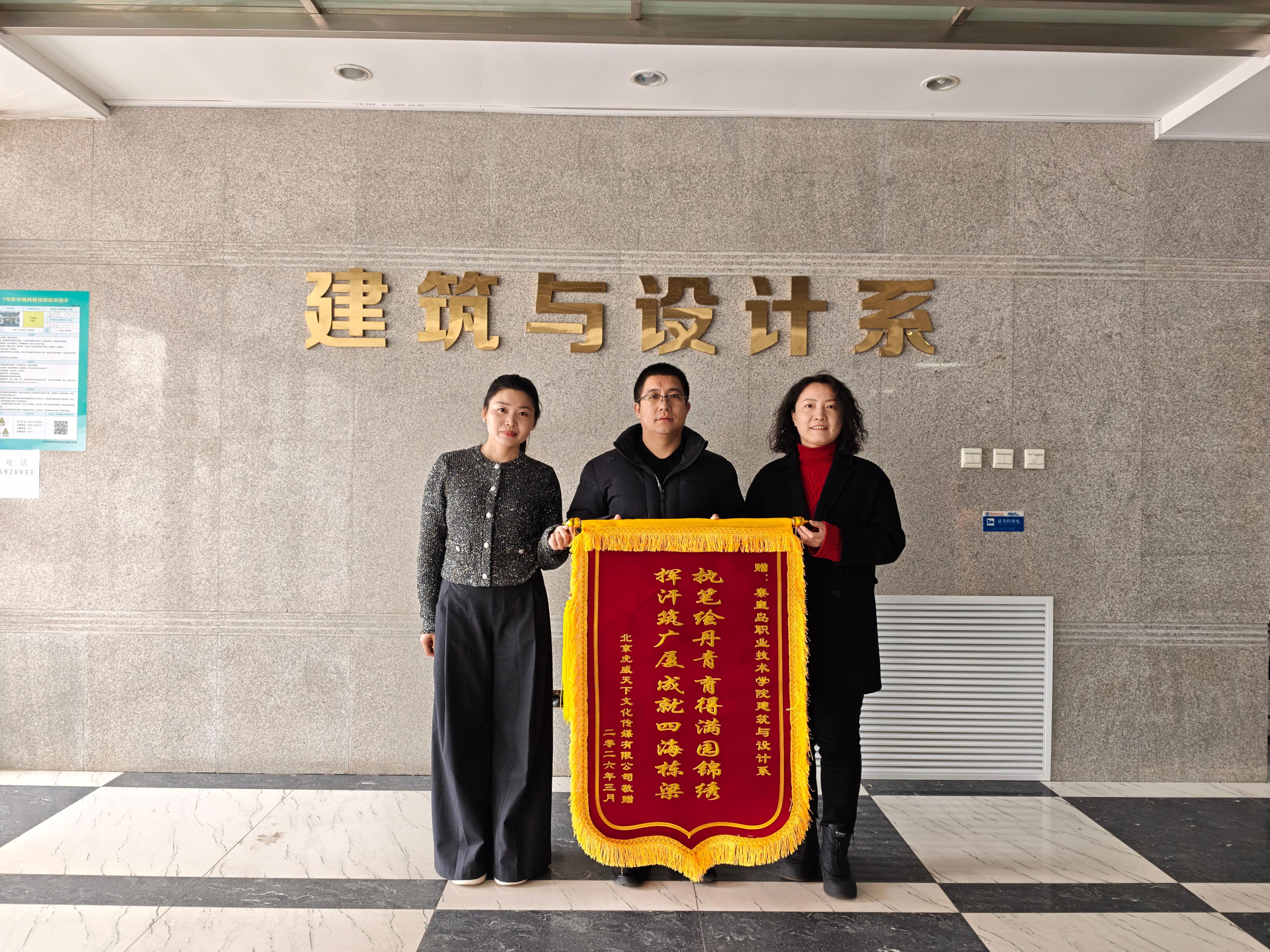 发布时间:2026-03-06秦皇岛职业技术学院作为国家骨干高职院校、国家优质高等职业院校,始终秉持"崇德尚能,求真创优"的校训,致力于培养高素质技术技能人才。在这一育人目标的引领下,建筑与设计系与北京虎威天下传媒有限公司、北京尚礼传习文化发展有限公司在专业建设、实习实训、文化传承等领域开展了广泛而深入的合作。企业代表高度评价了学院毕业生和实习生在岗位上展现出的专业素养与敬业精神,认为他们"技能扎实、适应力强、富有创新意识",已成为企业发展的重要力量。此次赠送锦旗与感谢信,不仅是对学校育人成果的充分肯定,更是对深化合作的殷切期待。