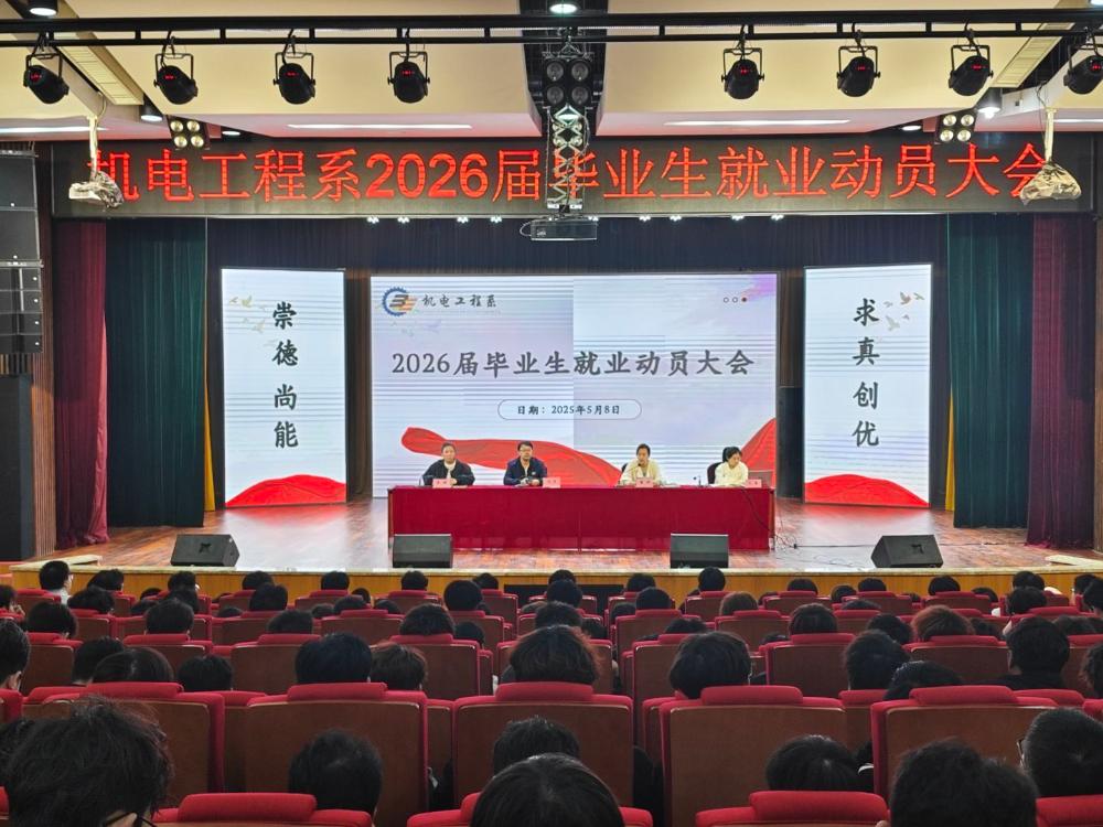 发布时间:2025-05-13【新闻中心讯】5月8日,机电工程系在学院报告厅召开2026届毕业生就业动员会。系党总支书记鲁妍、毕业班辅导员王夏、郭勇出席会议,2023级全体学生参会,学工办主任张健主持会议。