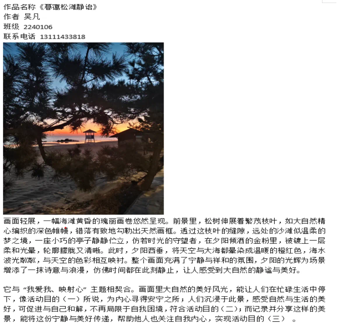 在这奇妙的大自然中,我们孕育出了一帧帧绝美照片,它们为“我爱我,映射心”活动增添了多彩的颜色,留下了不可磨灭的印记……我们可以在图片上看到积极昂扬的生活心态,看到崇尚自由的生活态度,看到繁花似锦的自然浪漫,看到烟火气息的人文景观,看到缤纷复杂的心理历程......一幅幅图片展现了摄影者的心境和心理历程,这是他们内心的真实写照,解剖自我心里,在自然中寻找归宿。参赛作品充满积极色彩,展现了选手对自然、对生活的热爱。