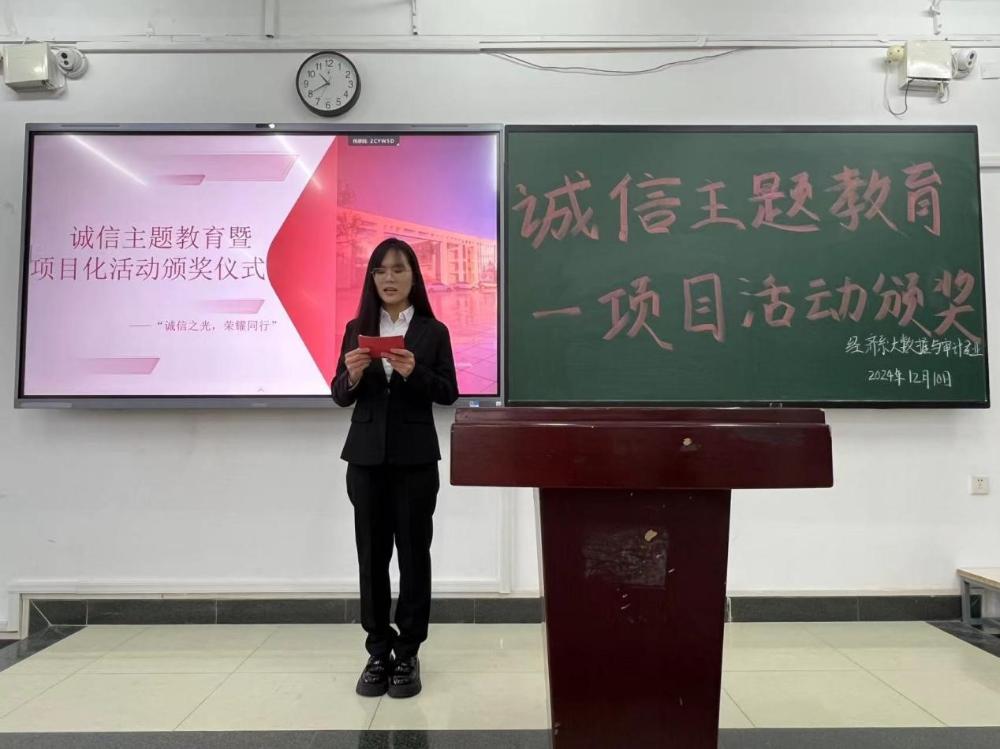 发布时间:2024-12-14为弘扬诚信文化,提升学生诚信意识,表彰在诚信主题教育活动和项目化活动中表现突出的个人和团队,12月10日,在3405教室大数据与审计专业举行了诚信主题教育活动暨项目化活动颁奖仪式。