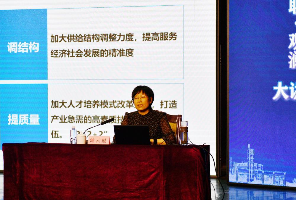 发布时间:2024-06-06【新闻中心讯】6月4日,学院邀请河北工业职业技术大学总督学、河北省政府督学、河北省高等职业教育高质量发展指导委员会专家池云霞教授“秦职·观澜”大讲堂,作专题讲座。讲座由学院党委书记、院长蔡大勇主持,学院领导、副科级及以上干部、各系(部、院)专任教师参会。