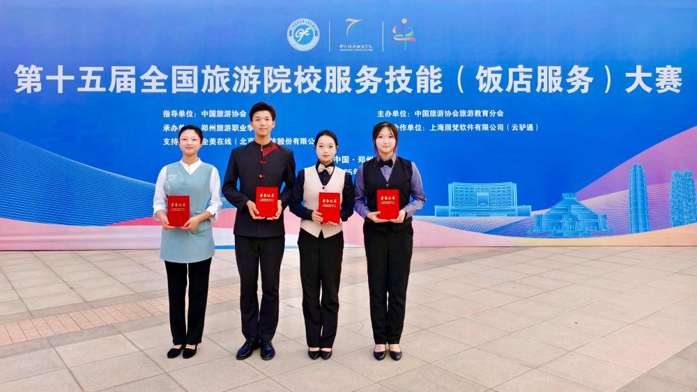 5月15-17日,第十五届全国旅游院校服务技能(饭店服务)大赛在郑州举行,由中国旅游协会旅游教育分会主办,郑州旅游职业学院承办。旅游与康养系韩浩然等四名同学分别参加中餐宴会摆台、西餐宴会摆台、客房服务和鸡尾酒调制四个赛项竞技,最终荣获全国二等奖1项、三等奖3项的优异成绩。
