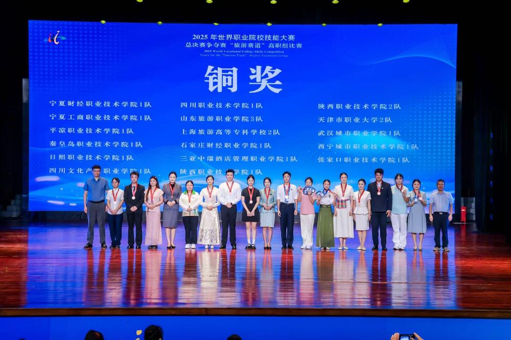 近日,2025年世界职业院校技能大赛(以下简称大赛)总决赛争夺赛“旅游赛道”高职组比赛在浙江旅游职业学院举行。旅游与康养系学生李宝莹、刘卓远、苏博雅、马思洁四位同学经过激烈角逐,获得铜牌。大赛由教育部等单位主办,浙江省教育厅承办,杭州市人民政府、浙江旅游职业学院协办,汇聚了全国32个赛区139所高职院校的174支代表队展开巅峰对决。