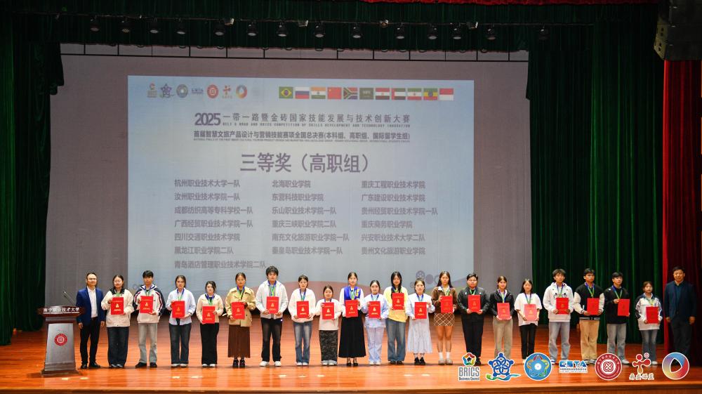 11月15日,2025一带一路暨金砖国家技能发展与技术创新大赛智慧文旅产品设计与营销竞赛全国总决赛在南宁市落下帷幕。我系张璐、张娅伟两位老师获教师组一等奖,郑子昭、尹维嘉、霍丙艳、尹子灿获高职学生组二等奖,王雨婷、彭佳慧、霍晨畅、李鑫阳获三等奖,学院荣获“最佳组织奖”。