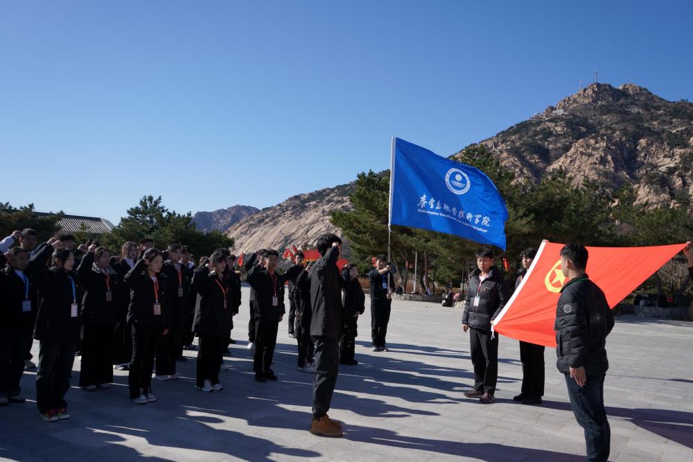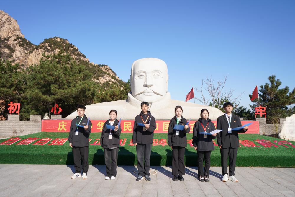 在五峰广场李大钊纪念雕像《铁肩》前,学员们合唱共青团团歌《光荣啊,中国共青团》,重温入团誓词。